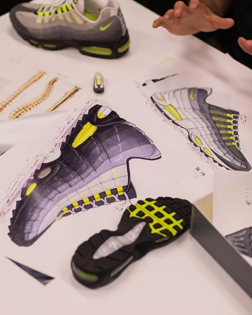Nike pays tribute to the original design sketches of the Air Max 95 with the introduction of the Nike Air Max 95 OG ‘Reverse Gradient’. The design is based on an early sketch by Sergio Lozano, in which the gradient flows from light to dark.