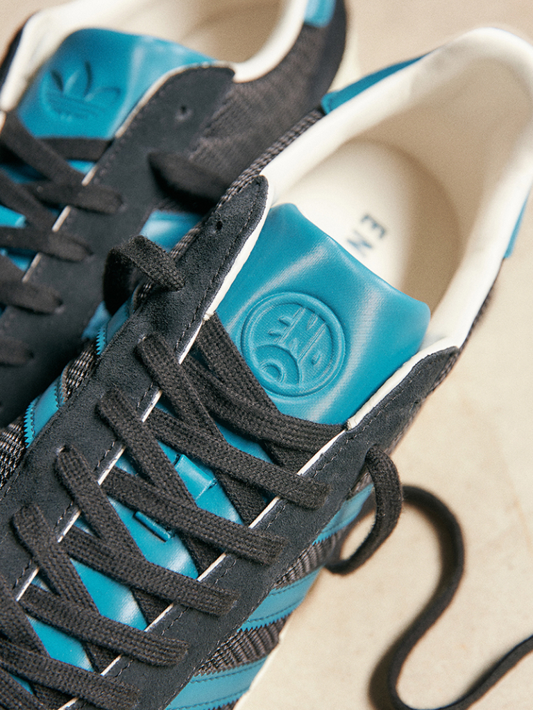 At the centre of the ‘Grass Roots’ collection sits the Gazelle Indoor Pro, reimagined in a black, white, and teal palette that pays tribute to END.’s hometown club colours. The silhouette maintains everything fans love about the classic terrace shoe while introducing subtle, bespoke twists that make it unmistakably END. Teal Three Stripes line the sides, while co-branded logos grace the heel tab, tongue, and insole – small details that nod to both football fandom and design finesse.