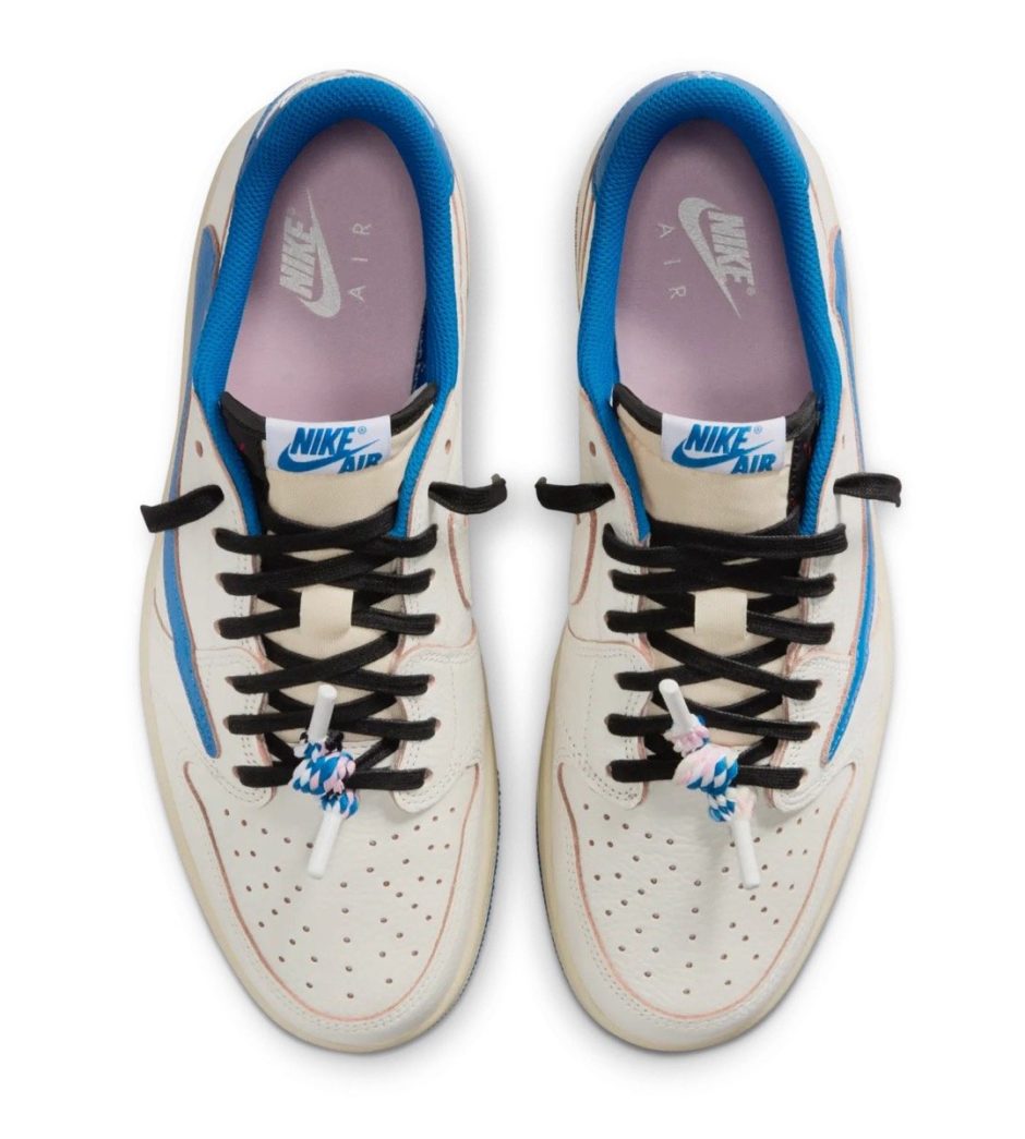 After months of teasers, the Travis Scott x Fragment Design x Air Jordan 1 Low OG is now confirmed. This version sticks to the clean and classic style of the original while adding some fresh updates. The sneaker has a white leather upper with Fragment’s signature ‘Military Blue’ on the reverse Swoosh and back tab. The midsole and tongue come in ‘Muslin,’ giving the shoe a retro, vintage vibe.